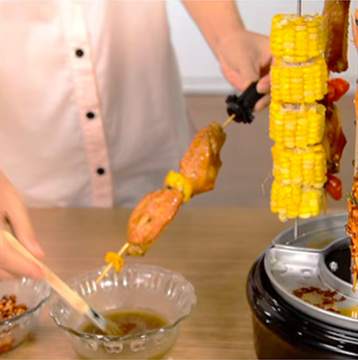 Place the skewered meat into the vertical grill, ensuring it is securely positioned.
